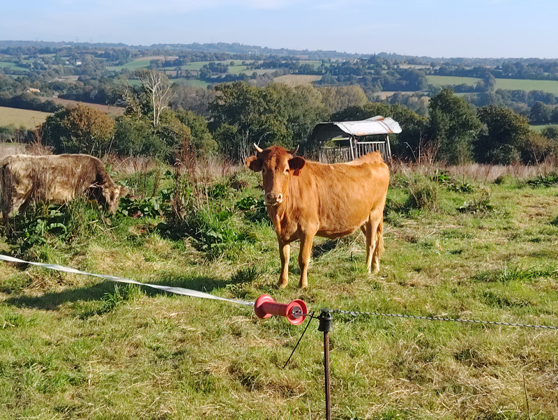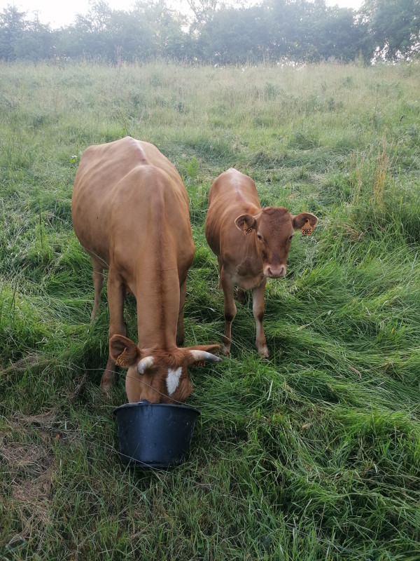 Suite au décès de son propriétaire, Logodenn, Froment du Léon de 10 ans et son veau, croisé Salers né en août 2025, cherchent une nouvelle maison. Logodenn est née à la ferme de Poulprenn et possède une bonne aptitude laitière (lactations entre 2000 et 2500L).