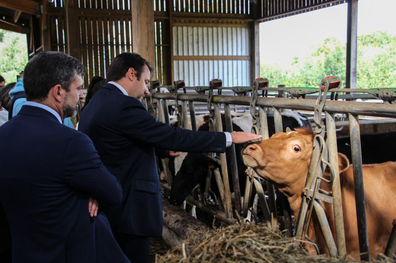Maïa KRONOVSEK et Thibaut LE CORRE lui ont expliqué la décision d'intégrer la race Froment du Léon au sein du troupeau du lycée.